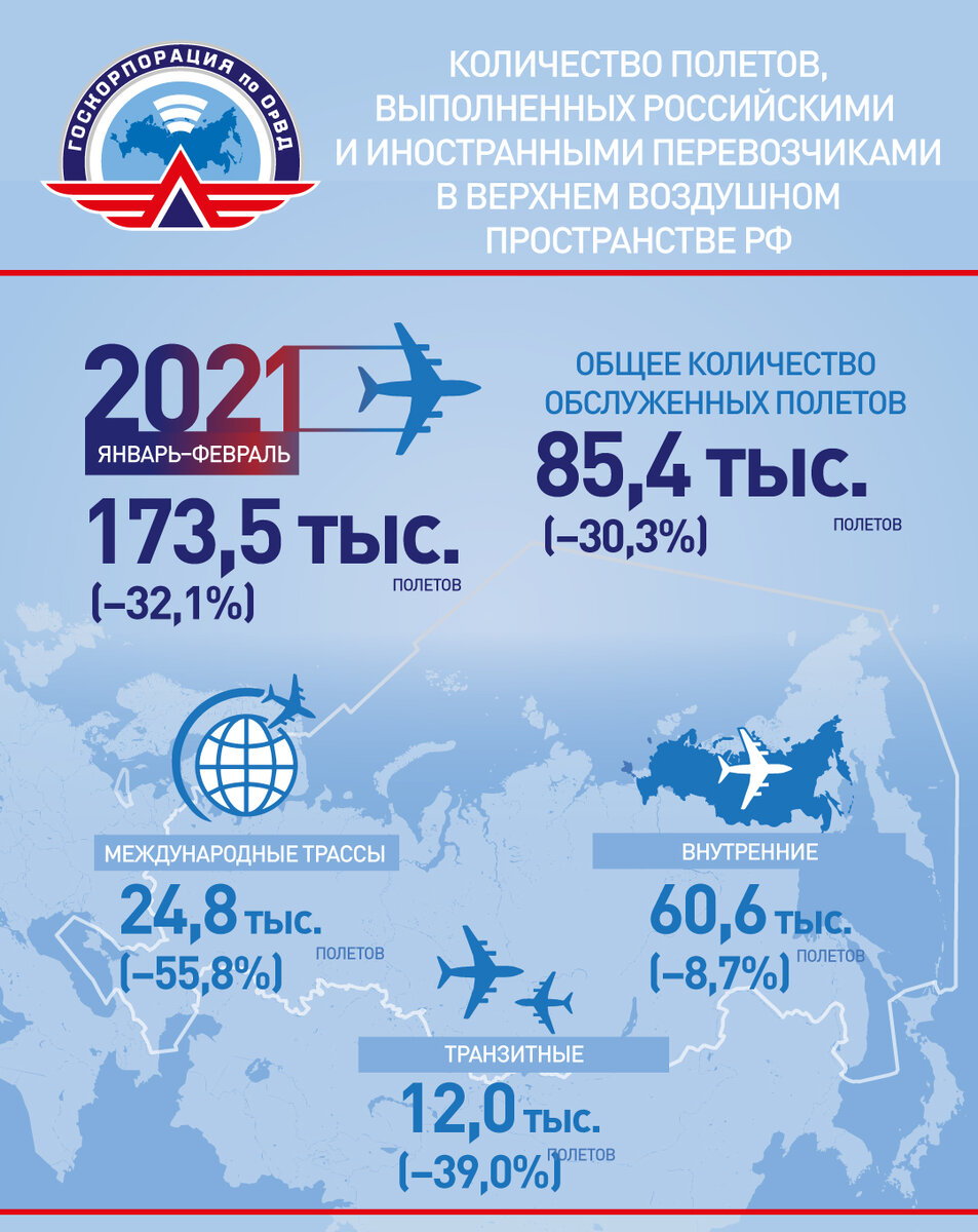 В феврале 2021 года российские авиадиспетчеры обслужили в верхнем воздушном пространстве страны 85,4 тыс. полётов, уменьшив этот показатель относительно того же периода прошлого года на 30,3 %.