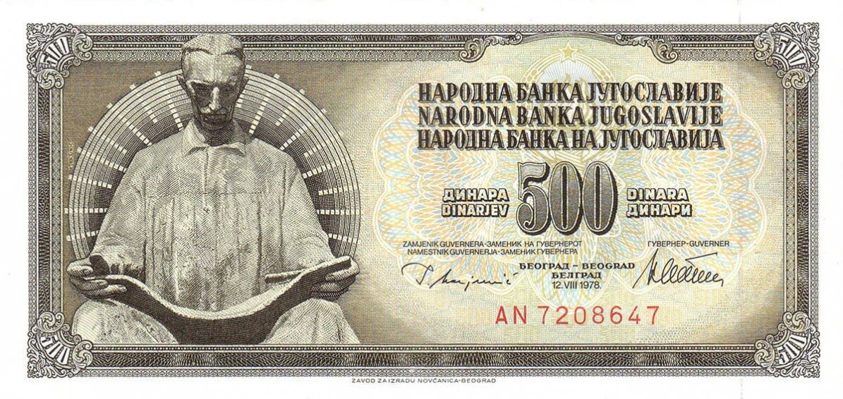 Размер: 156х74 мм. Защитные элементы: цветные волокна. Банкнота 500 динаров была выпущена с тремя датами 12 августа 1978 г., 4 ноября 1981 г. и 16 мая 1986. Ее основные цвета — оттенки темно-оливкового на многоцветном фоне. Надписи на лицевой и оборотной сторонах каждый раз повторяются на всех официальных языках и алфавитах республики (латиница для хорватского и словенского языков, кириллица для сербского и македонского). Банкнота вышла из обращения в 1990 г., когда, обесцениваясь все больше и больше, динар претерпел деноминацию и был переименован в югославский конвертируемый динар, который обменивался на старый по курсу 1: 10 000.