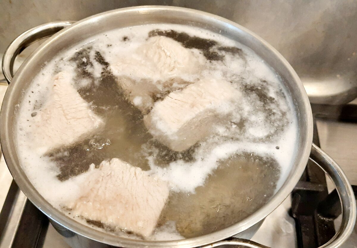 Грудку ставим вариться на средний огонь, снимая пену (я не солю). Индейка варится около 20 минут, куриная грудка быстрее.