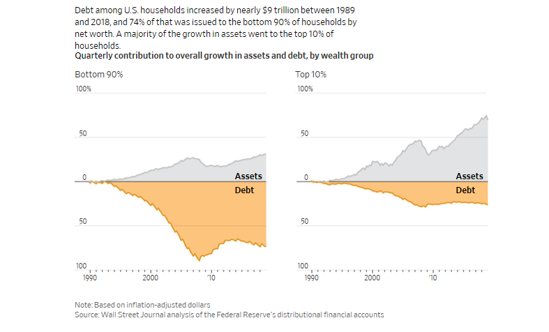Посмотрите на график, показывающий, как сильно только за последние 30 лет вырос разрыв между чистыми активами (активы минус обязательства) 10% наиболее богатых и оставшихся 90% домохозяйств США.