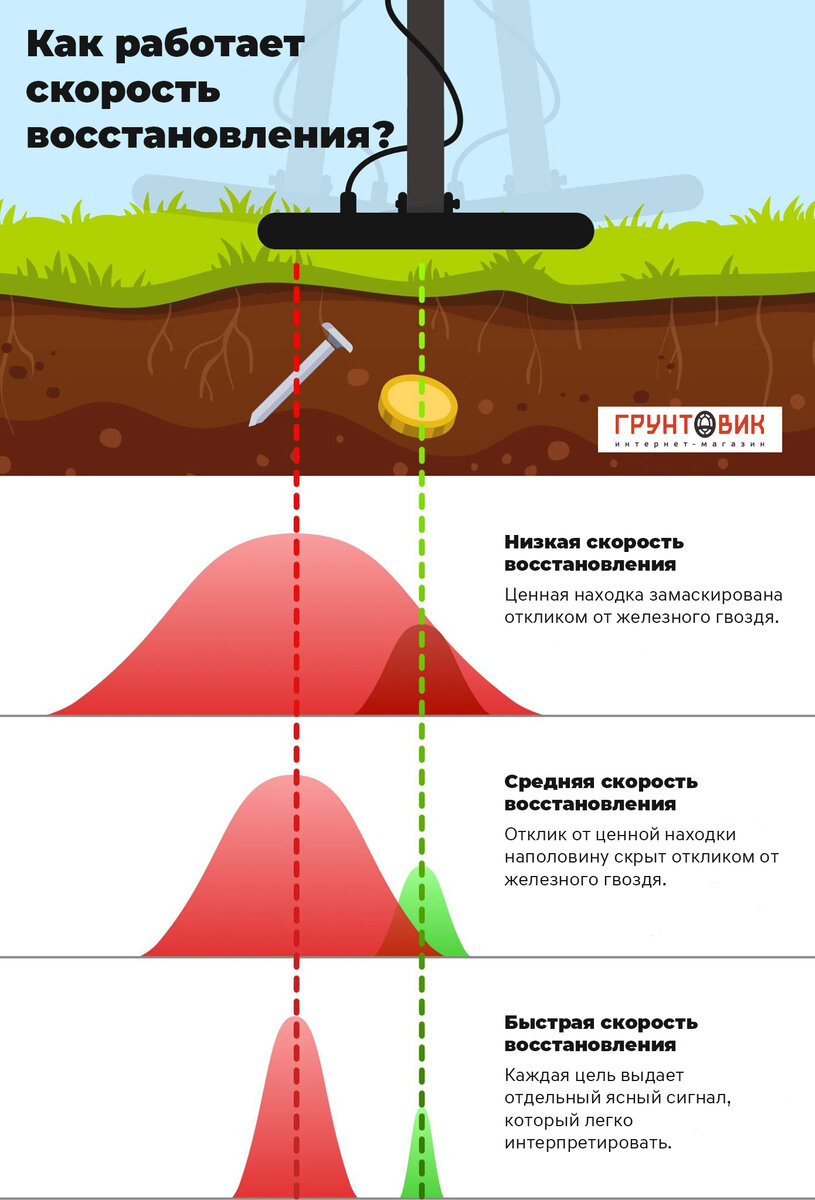 Для тех, кто хочет узнать, как скорость восстановления влияет на процессы обнаружения металлов, будет полезна эта иллюстрация. Здесь можно увидеть разницу в обработке ответа от двух разных целей - потенциально ценной цели и близко расположенного к ней железного гвоздя - в зависимости от скорости восстановления металлоискателя.