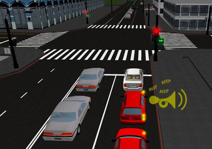 Водителя белого автомобиля, которому нужно ехать прямо поставим за этими двумя красными автомобилями, которые только вчера возмущались, что им перекрыли проезд. Но происходить все будет в другой фазе светофора.