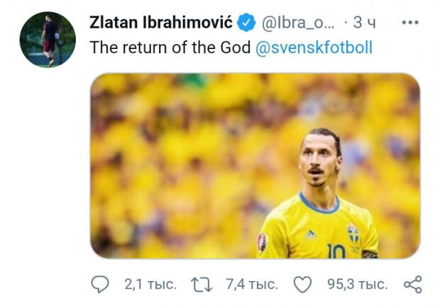 39-летний футболист получил вызов на мартовские матчи квалификации ЧМ-2022. Швед прокомментировал это событие, написав в инстаграме: «Бог возвращается». Также игрок тегнул официальный аккаунт сборной Швеции.