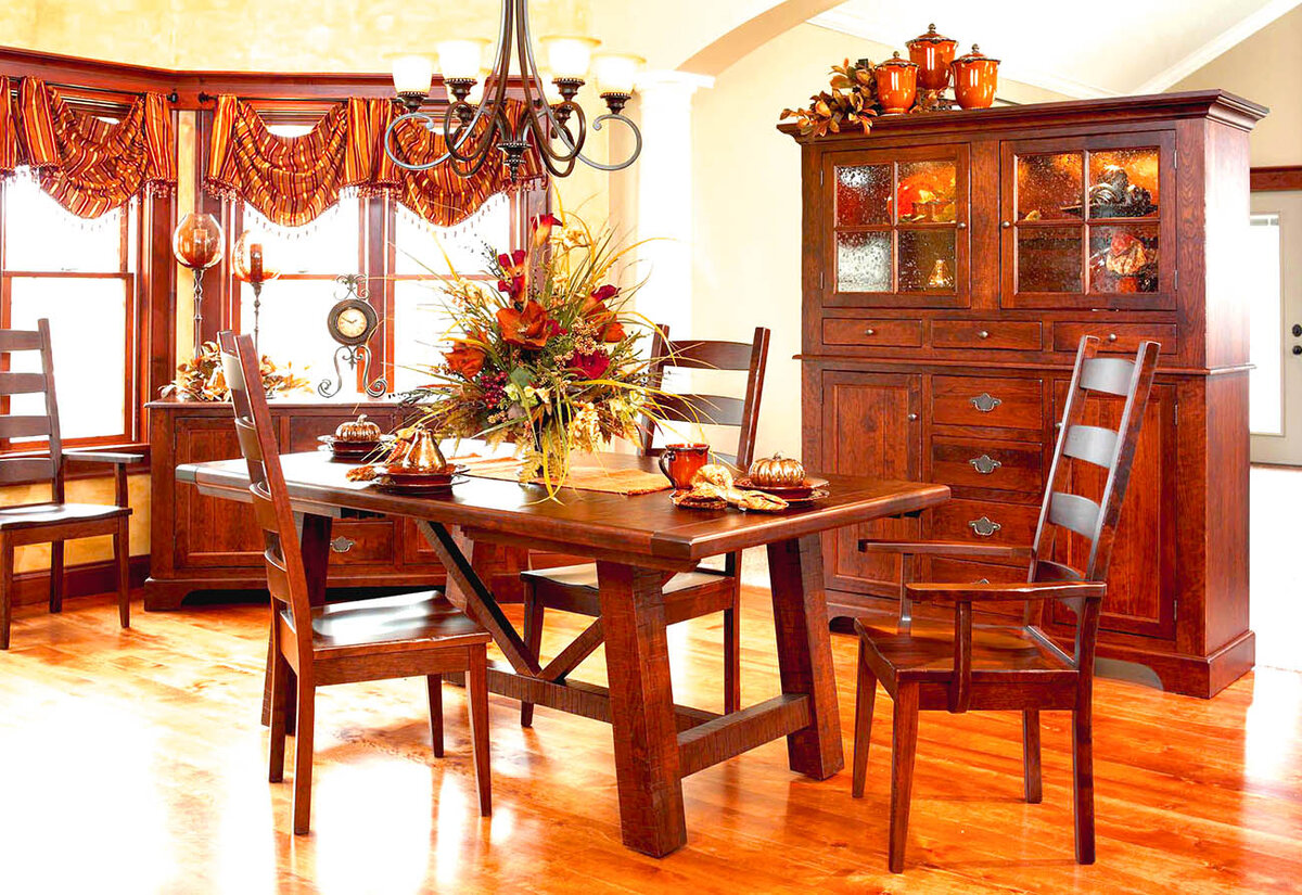 Первым делом нужно отметить, что материалом для изготовления мебели в стиле кантри служит дерево (сосна, орех, вишня или дуб), однако допустимы и элементы из искусственно состаренного металла. Также предпочитается использовать неполированную мебель. Выглядит деревянная мебель немного грубовато, она всегда имеет натуральные и не кричащие оттенки, что придает определенное спокойствие жилищу. Вы создадите в своем доме дополнительный уют, разместив в нем плетеную мебель – диван или же кресло-качалку, которая как нельзя лучше подойдет для интерьера в стиле кантри.