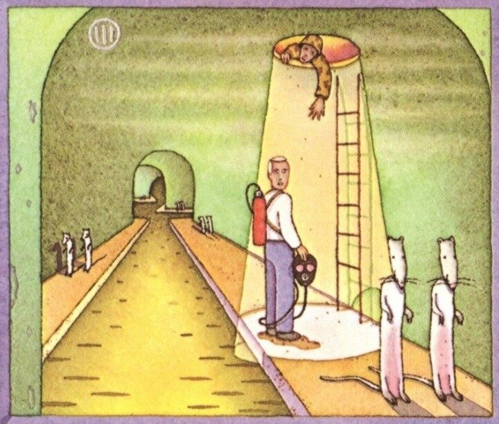 Во-вторых, типичный рашнбизнисмен и типичный топ-менеджер ничем не отличается от Йона Тихого и прочих героев "Футурологического конгресса". Вроде бы кажется, что есть вокруг "нормальная реальность", в которой кругом успешный успех - только выдели бабла, найми маркетолоха, создай лендинг. Но что-то тревожит, и герой прорывается на слой реальности ниже, в которой он находится в парке аттракционов на слегка поскрипывающем колесе обозрения. Картинка всё ещё неплоха, но уже не люкс. И при этом всё равно выглядит подозрительно. Постепенно герой прорывается на более правдивый слой - и оказывается где-то в глуши в тайге, прикованным к нарам в адски холодной избе. При этом героя люто колбасит от медикаментозной ломки. Но и это не конец - и самым нижним и самым реальным и правдивым слоем оказывается канализация, где наши герои оказываются стоя на коленях и без остановки блюя. Потому что надышались боевым нервно-паралитическим газом, вызывающим одновременно мощнейшие галлюцинации и бесконечную рвоту.