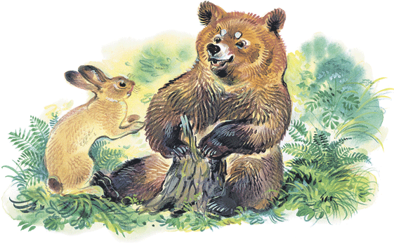 Понял всё Медведь, вытащил косого за уши, отстегал хворостиной и выгнал из лесу. И с зайцами дружить зарёкся.