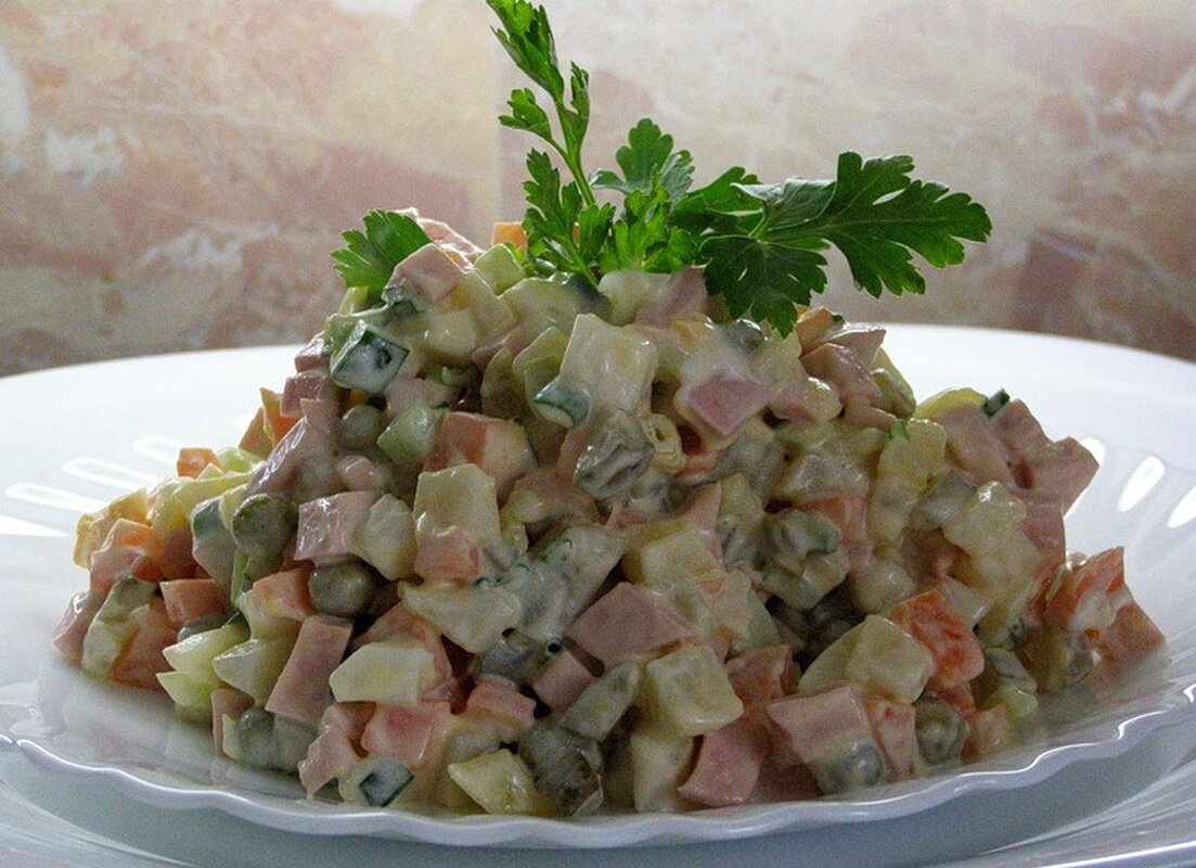 Классический салат Оливье в советское время готовили исключительно с вареной колбасой, желательно - с Докторской. Мы не оступили от традиции и приготовили Оливье по канонам советской гастрономии.