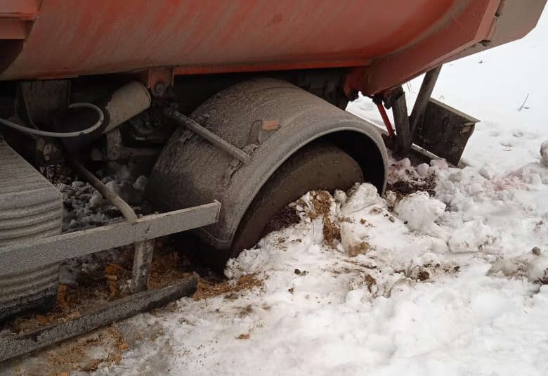 Мусоровоз подъехал к контейнерной площадке, забрал из накопителей отходы, но выехать дальше по маршруту не смог — колёса угодили в рыхлый снег и грязь.