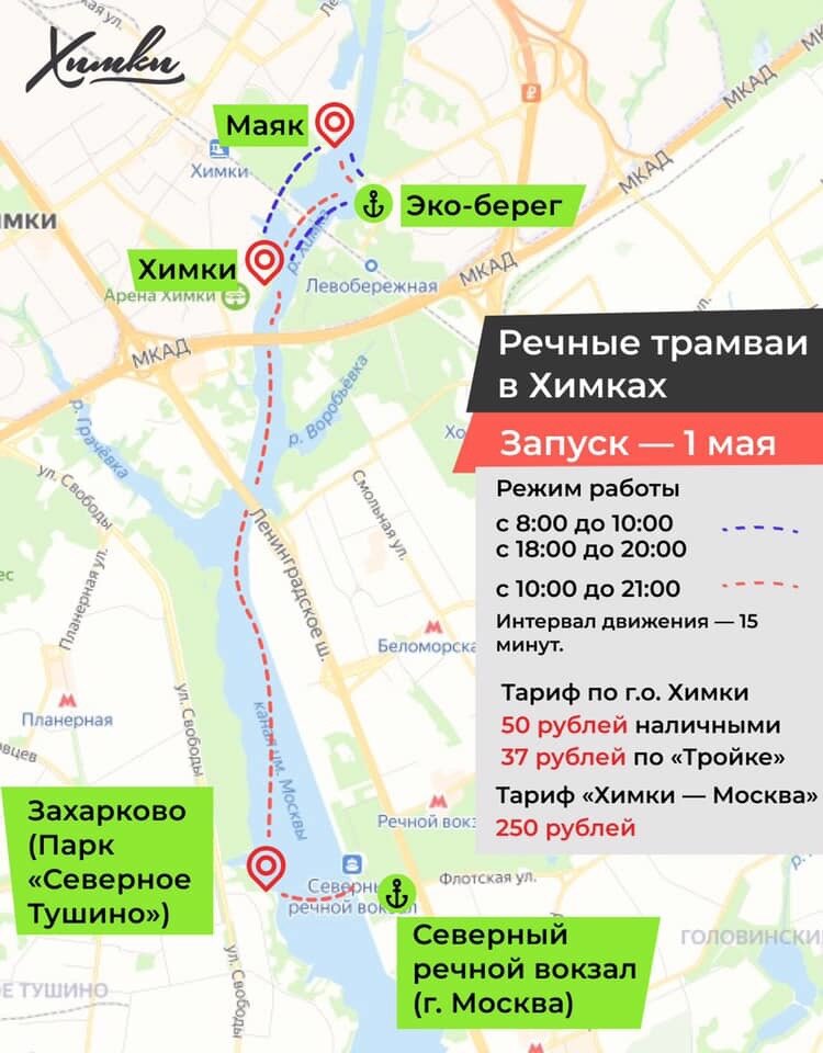1⃣ С 8:00 до 10:00 и с 18:00 до 20:00 теплоходы будут курсировать по кольцевому маршруту между причалами «Маяк», «Эко-берег», «Химки». На