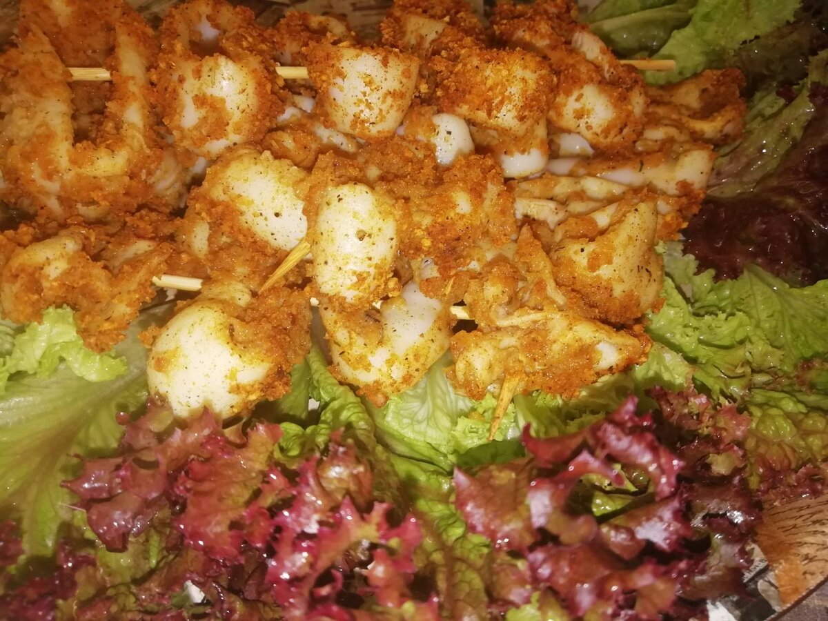 - Запанированные кальмары насадить на деревянные палочки, как шашлык или просто выложить на противень или на решетку гриля.