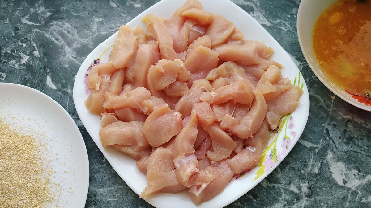 - Нарезаем куриное филе на ломтики. Можно заморочиться и сделать все кусочки одинакового размера. Я же использую всё филе полностью, поэтому какие-то кусочки получились маленькими, какие-то чуть больше. Меня это не особо расстраивает.
