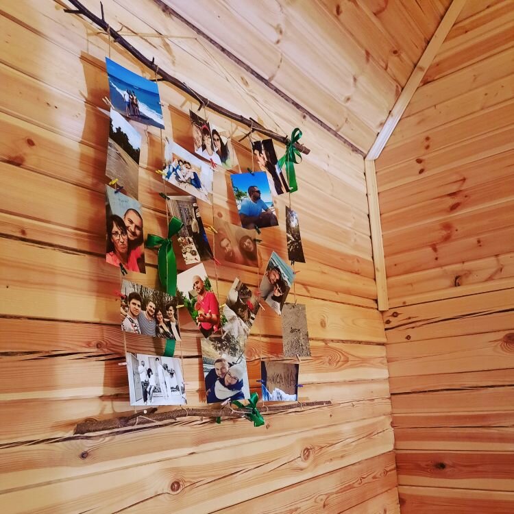 Срубаем ветки средней толщины. Я ничем не обрабатывала, просто просушила несколько дней. Обвязываем шпагатом, вешаем фотографии на маленькие прищепки, у меня 2,5 см, купленные на WB. Декорируем на свой вкус и готово!
