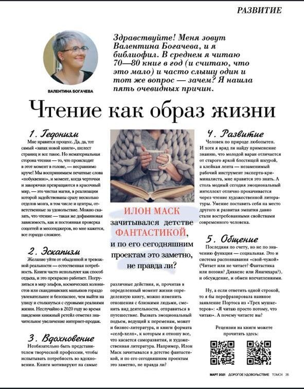 В мартовском номере журнала Дорогое удовольствие Томск вышла моя первая колонка про книги.