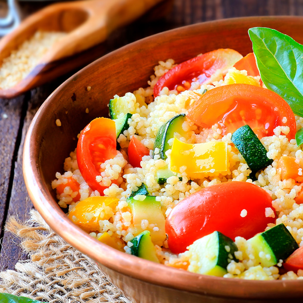 - Кускус высыпьте в кастрюлю и заправьте оливковым маслом и солью, перемешайте.