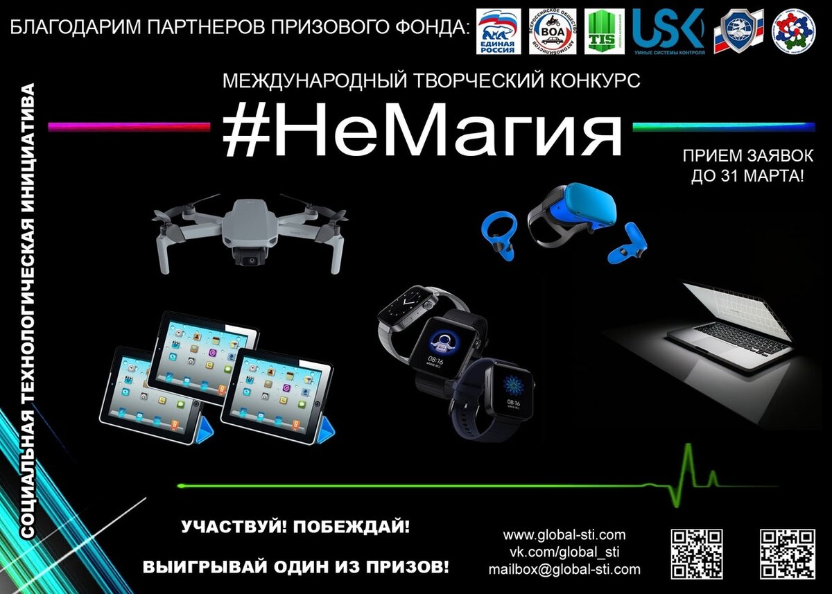 Напомним, что творческий конкурс #НеМагия стартовал в феврале текущего года. К участию в нём принимаются текстовые, художественные и видеоработы, в которых с помощью различных форм творчества рассказывается о том, как современные технологии решают социальные проблемы в самых разнообразных сферах жизни (медицинская помощь, охрана окружающей среды, ликвидация последствий стихийных бедствий, благотворительность, социальная поддержка граждан и др.).Сбор конкурсных работ продлится до 31 марта 2021 года включительно.Отправить свои текст, рисунок или видеоролик для участия можно в специальной гугл-форме, размещенной на сайте https://www.global-sti.com/notmagic . Там же можно найти все подробности проекта и кейсы примерных тем работ.