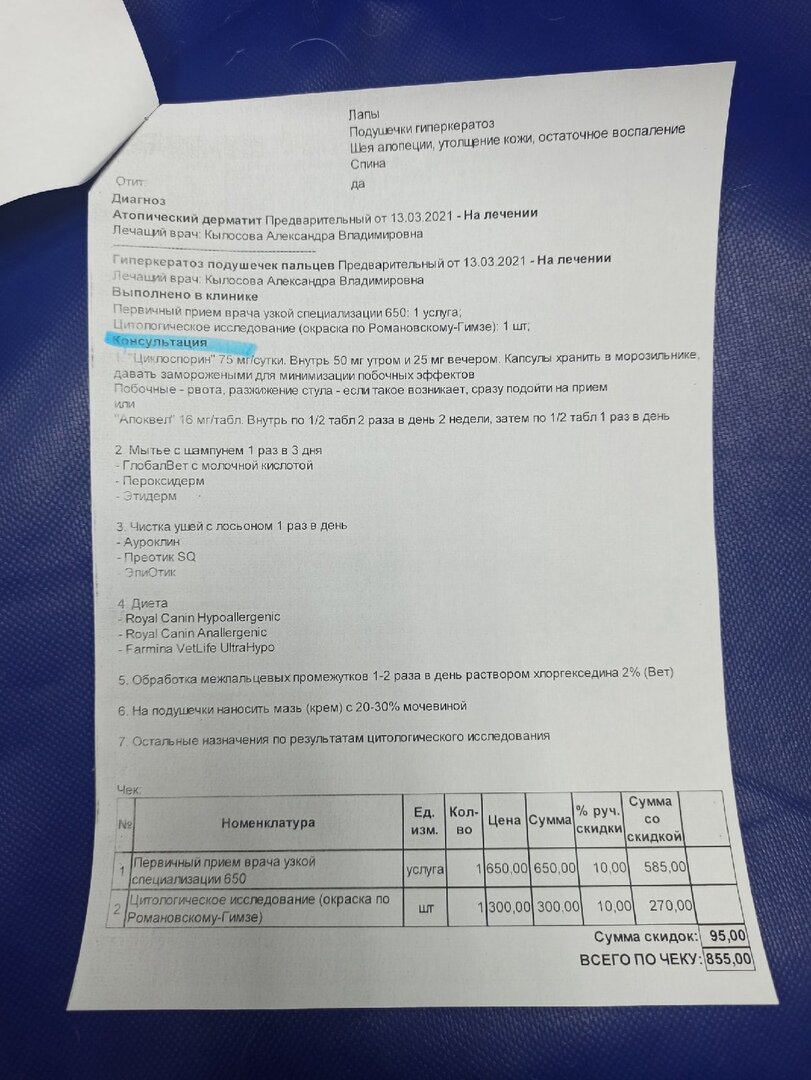 Самые необходимые затраты: долг 15100р, корм в банках 2200р, таблетки Экорал 3300р., лосьон для чистки ушей 1000р за один флакон (хватает не на долго). Через неделю-две снова на прием.