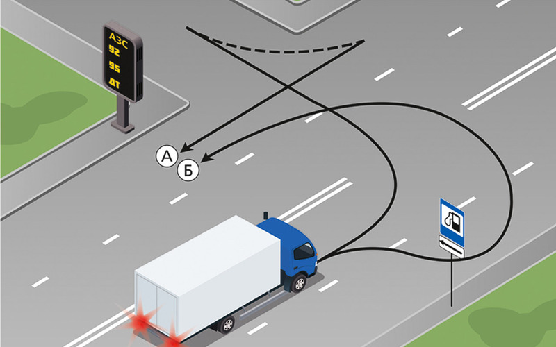 Вам нужно развернутся и вы видите заезд на заправку, но развернутся в один присест нет возможности, по какой траектории вы выполните разворот и вообще можно ли его здесь сделать?