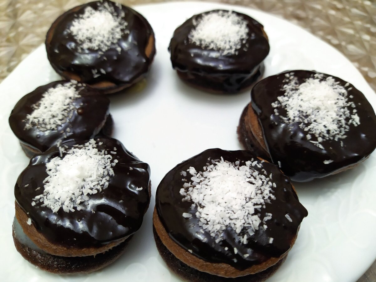 Готовые печенья переложить на тарелку, дать остыть немного и можно угощаться. При желании можно собрать их по две штуки, сделав прослойку, полив шоколадной глазурью и посыпав кокосовой крошкой или орешками. Я так и сделала)