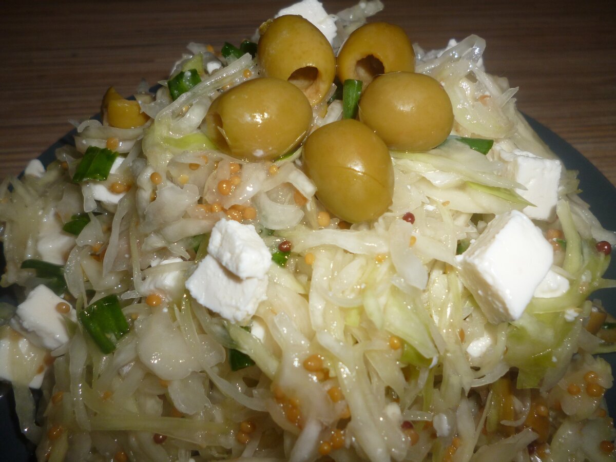 Недавно я искала рецепт какого-нибудь салата с брынзой или фетой и наткнулась на это чудо. Называлось оно "Греческий салат на зимний лад" и готовится ... из капусты. Я о таком даже