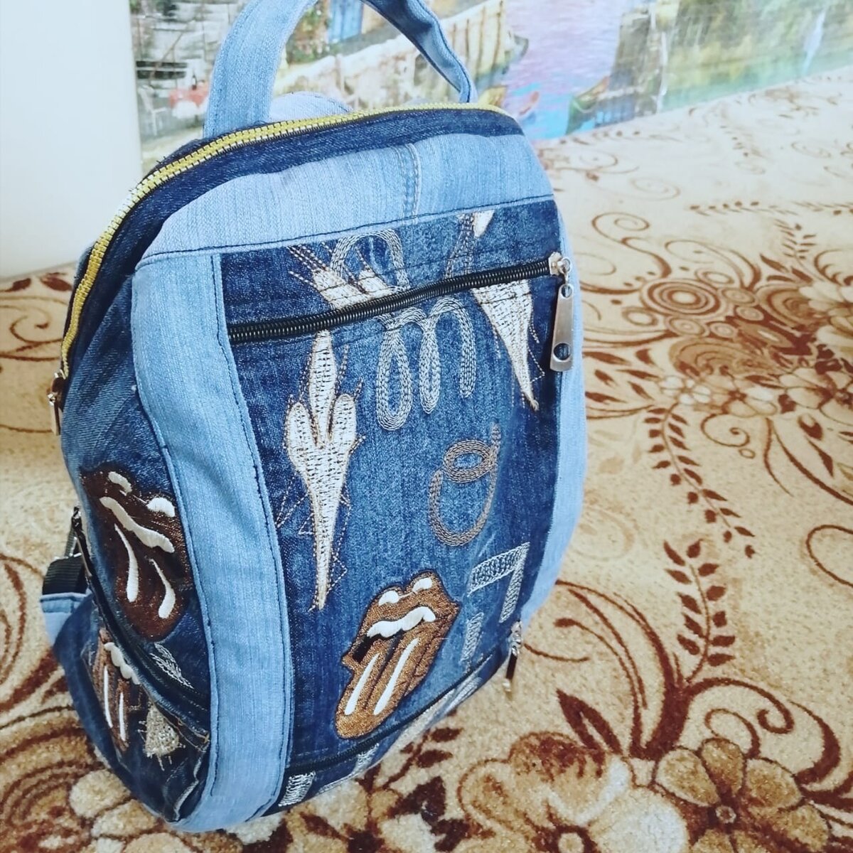 Следующая моя работа -это рюкзак из джинсовых брюк темной и светлой расцветки. Это детали переда рюкзака с двумя внутренними карманами на молнии.