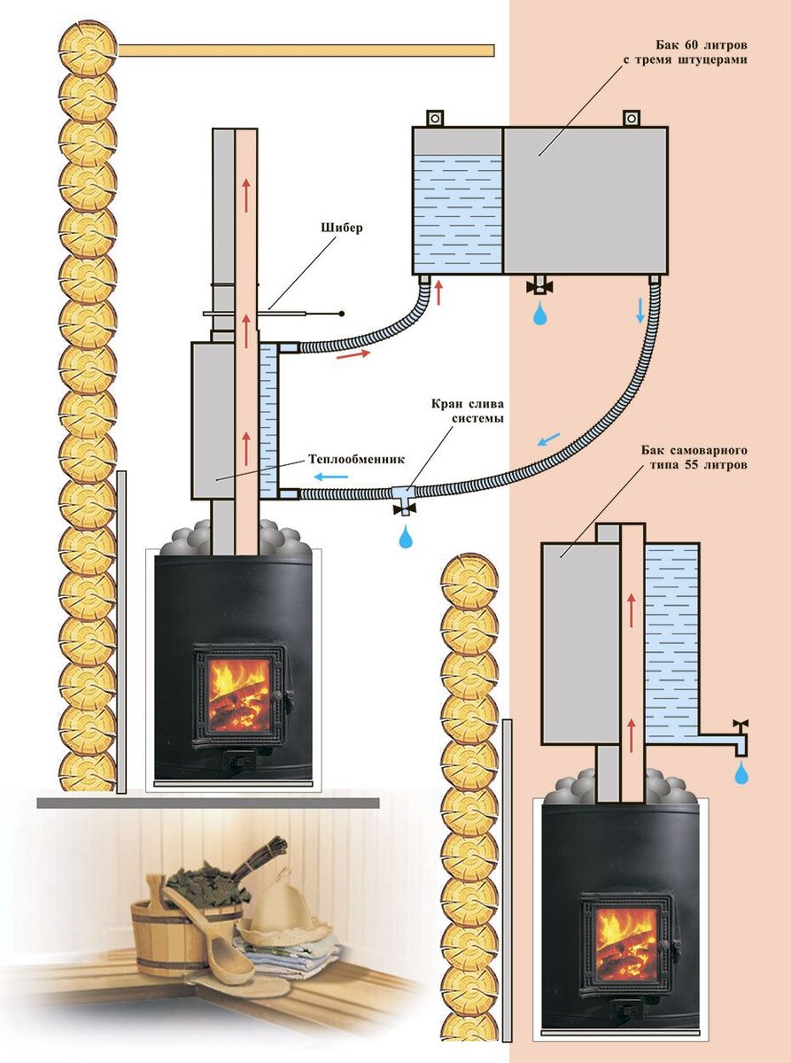 Бак для воды может устанавливаться в парной, в непосредственной близости от теплообменника, или в помывочной.