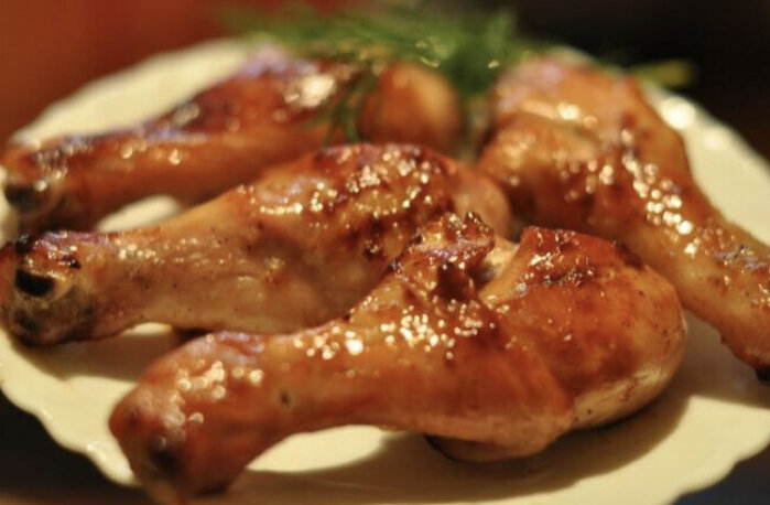 - ШАГ 4Запекать куриные ножки в горчично–медовом маринаде около 40 минут, поливая остатками маринада.