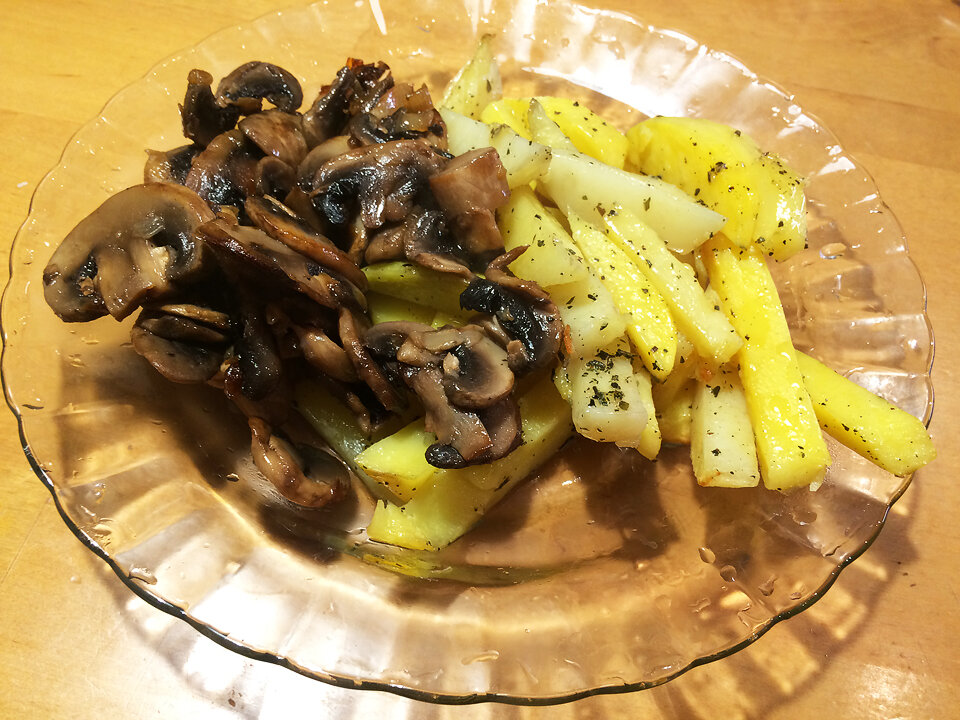 А пока мы возились с шампиньонами, картошка наша поспела и стала вполне мягкой. Степень зажарки каждый регулирует на свой вкус, меня устроила такая. Теперь просто соединяем грибы и картофель в одной тарелке, и можно есть. Блюдо вполне себе постное, но при этом калорийное и сытное. Так что даже в период Поста можно на таком продержаться какое-то время.