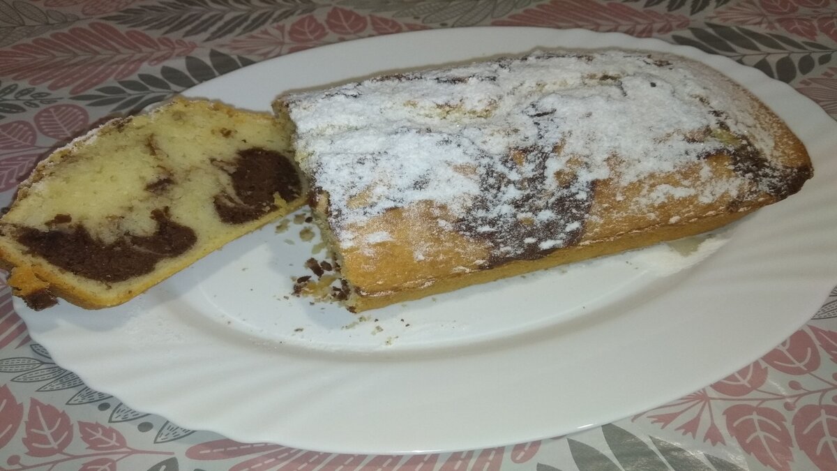 - Берём форму для выпечки, смазываем ее растительным маслом. Заполняем форму готовым тестом. В миске оставляем немного теста и к нему добавляем какао и хорошенько перемешиваем. Теперь в форму с тестом ложкой добавляем получившееся шоколадное тесто в хаотичном порядке.