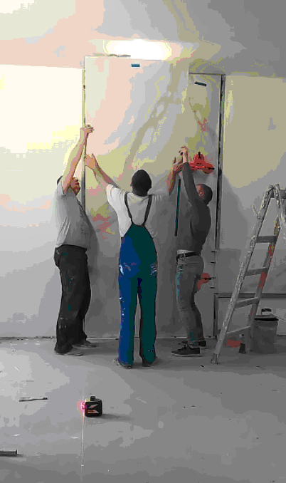 Бригада плиточников клеит на гипсовую штукатурку крупноформатную плитку размером 1х2,5 метра с помощью Плиточного клея "Керамогранит эластичный" Торговой марки "Скоры ремонт"