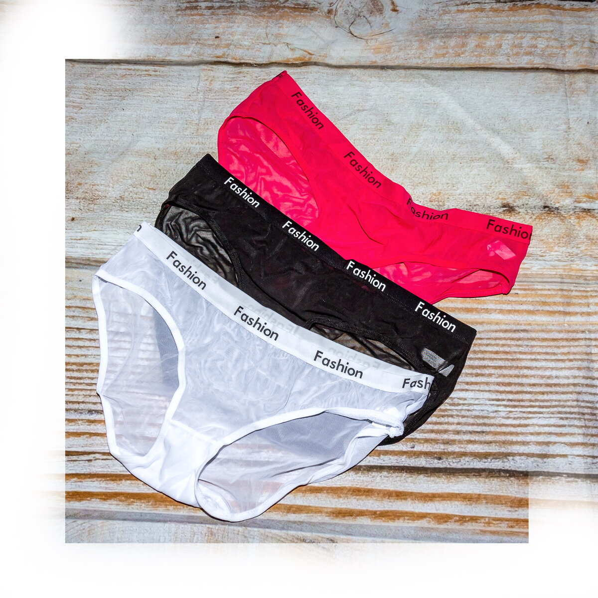 Модель полностью соответствует заявленной продавцом. По верху широкая не тугая резинка с яркой надписью. Сами трусики сшиты из сетчатой ткани. Состав 90% нейлона и 10% спандекса.