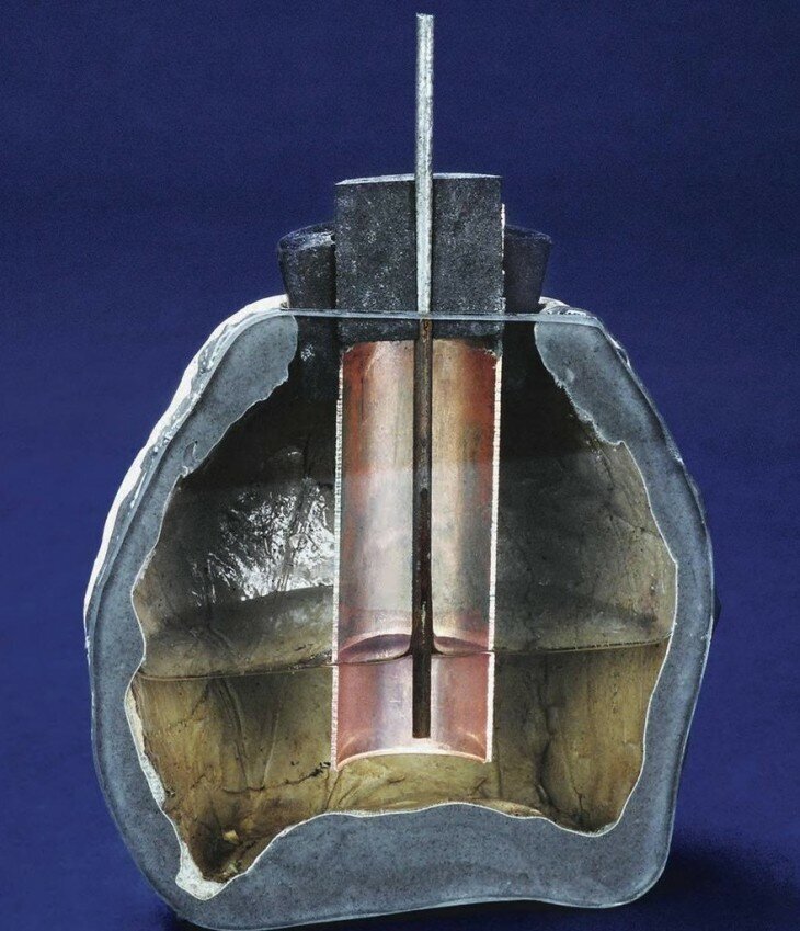 Древняя багдадская батарейка представляет собой горшочек с битумной пробкой. (Битум - это твердое или смолистое вещество из углеводородов и их производных в виде азотистых, сернистых, кислородо- и серосодержащих соединений.) Из битума наружу выступает железный стержень, окружённый медным цилиндром. Если наполнить горшочек уксусом, он создаст напряжение около 1,1 В.
