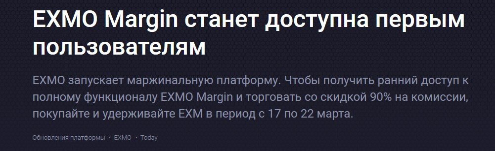 Примерно месяц назад криптовалютная биржа EXMO ( обзор ) сообщила клиентам, что к марту готовит сюрприз. Новшество оказалось запуском маржинальной торговли, которое стартует в ближайший понедельник, 22 марта.