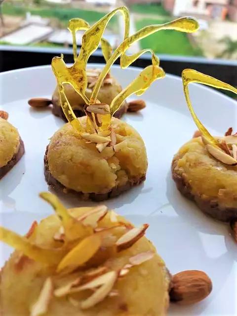 Возьмите небольшие формочки и смажьте их топленым маслом. Положите слой картофельной халвы, наполнив чашу наполовину, чтобы масса приняла форму. Затем нанесите слой рабди. Затем сверху нанесите слой миндальной халвы и аккуратно прижмите. Оставьте всё на 10 минут и затем аккуратно разложите на сервировочном блюде.