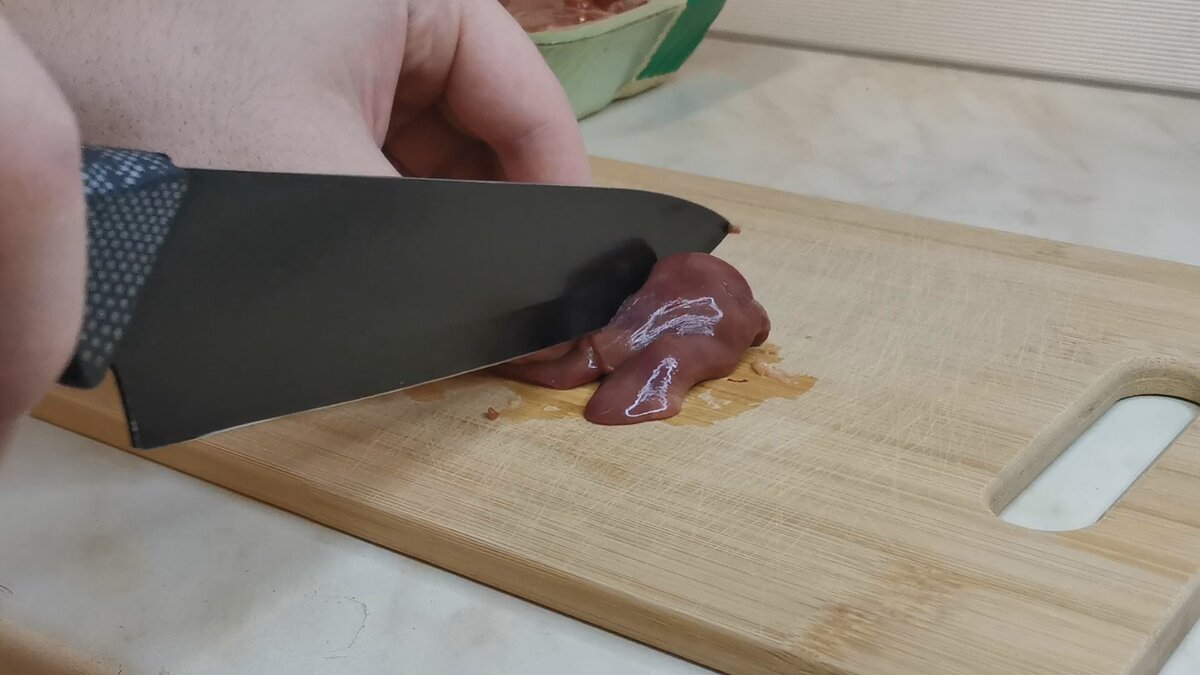 Берём куриную печень, очищаем её и режем на средние кусочки. Конечно можно и любую другую печень, например индейки. В целом это не имеет огромного значения.