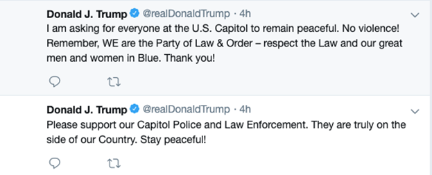 Рассуждая о блокировке аккаунта Трампа у многих может возникнуть вопрос: «Имеем ли мы право осуждать действия администрации Твиттера, ведь это частная компания, которая имеет право принимать решения согласно своим корпоративным правилам и убеждениям?». Отвечая на этот вопрос, стоит углубиться непосредственно в суть самого приложения. Твиттер – будучи «новым медиа», имеет крайне широкий информационный охват, и многими пользователями воспринимается так же, как и традиционные медиа, а для многих пользователей Твиттер, наверное, является даже более надежным источником информации, нежели традиционные медиа, учитывая современную тенденцию к снижению доверия к СМИ в американском обществе[1]. Сам Твиттер, при этом, позиционирует себя как свободное медиапространство, как площадку для диалога и обмена мнениями, идеями и информацией[2]. Важно учесть, что последние сообщения Трампа не несли в себе никаких призывов к насилию, их содержание заключалось в критике политики Твиттера, который неоднократно подвергал цензуре высказывания президента США. Непосредственно во время штурма, Трамп наоборот, призывал народ к спокойствию и уважению закона, упоминая также об уважении к полиции Капитолия.