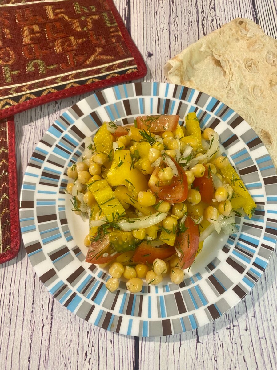 Смешиваем все ингредиенты, нут, овощи, соль, перец, добавляем сок лимона, масло.