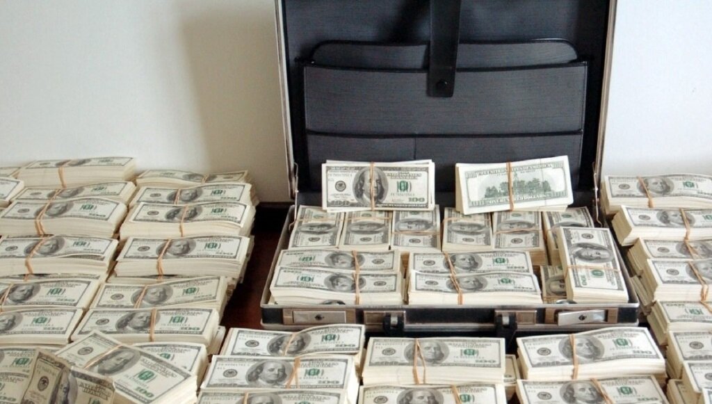 Он думает, потом открывает сумку, прямо в ней рассматривает пачки денег, так же, прямо в сумке, не вынимая, неуклюже пытается пересчитать пачки денег, затем «лохматит» несколько из них, прикидывает что-то в уме.