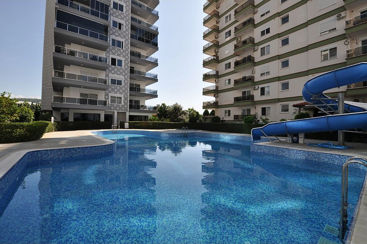 Живем на третьем этаже. До моря недалеко, метров 400, что очень неплохо: с одной стороны сырость зимой не доходит, а с другой ― пешком в жару до пляжа можно дойти без проблем. В комплексе есть открытый бассейн с горкой, сад, зона для барбекю, тренажерный зал, джакузи, сауна, хаммам. Удобно, что есть беспроводной интернет. Место очень удачное, практически в центре района Махмутлар. Рядом остановка автобуса, фермерский рынок: он работает только по вторникам, но зато молочку, овощи и фрукты можно взять в сезон «за копейки».