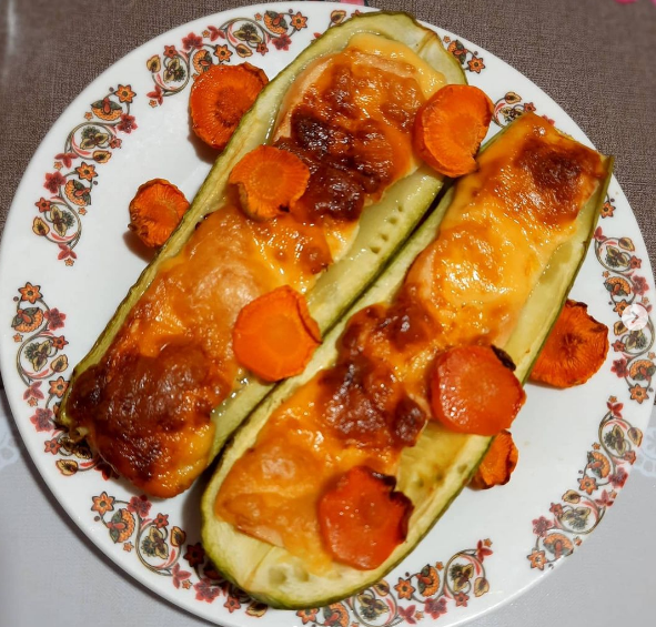 Кабачок моем нарезаем пополам, вынимаем ложкой мякоть в середине (можно нарезать и уложить тоже как слой на курицу).