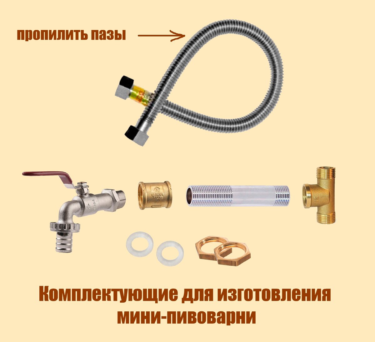 Следующие комплектующие - кран, сильфон из нержавейки медная трубка, шланги, утеплитель и фитинги есть в товарах для дома. Фитинги можно брать латунные, агрессивной среды и очень высоких температур в заторном чане нет. Нам понадобится сгон, муфта, две прокладки из силикона или пищевой резины, тройник, две гайки, фум-лента. Все резьбы 1/2 дюйма или на 15.