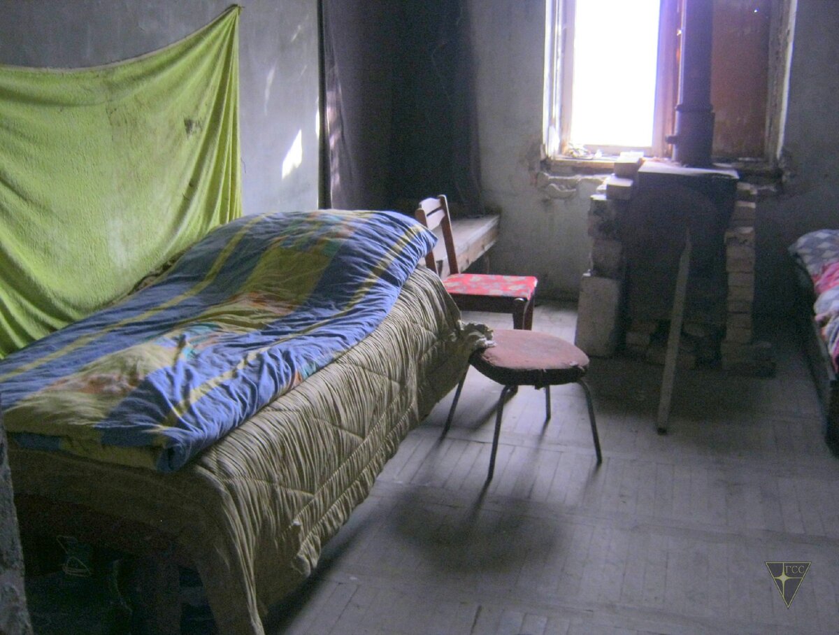В небольшом помещении вдоль стен стояли две кровати, деревянный лежак и стол. Возле окна притулилась неказистая самодельная «буржуйка», выставив дымовую трубу в форточку. Недостающее остекление заменяли листы фанеры. В углу возле входа стоял большой баллон с газом и плитка. Над столом висел настенный шкафчик, набитый посудой, столовыми приборами и пакетами с лапшой быстрого приготовления. Нехитрый интерьер дополняли три старых стула.