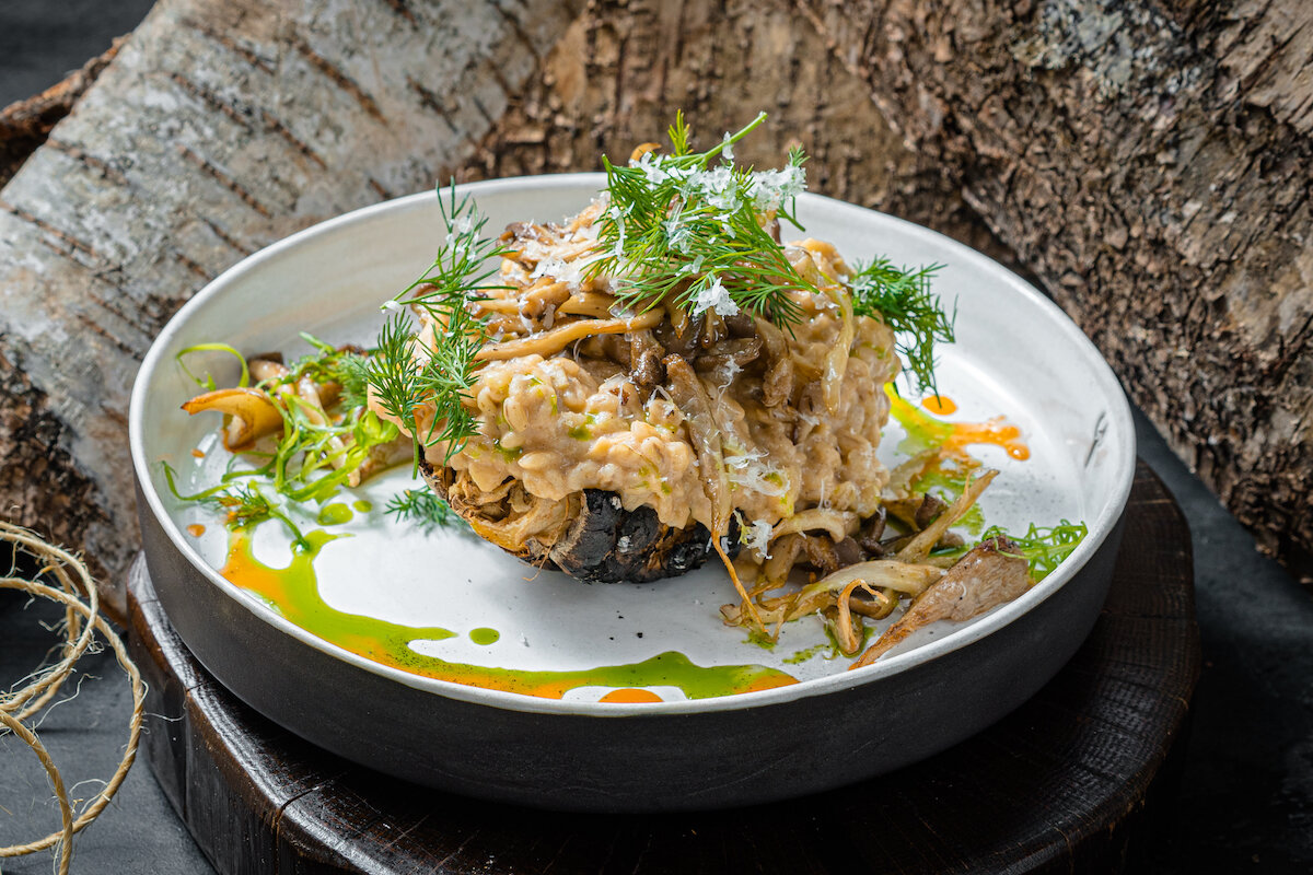 - Сервируем кашу в корне сельдерея и посыпаем соевым пармезаном.