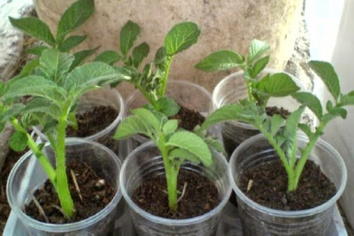 К моменту высадки на постоянное место рассада имеет толстые стебельки и густую листву, она похожа скорее на комнатный цветок, чем на картофель.