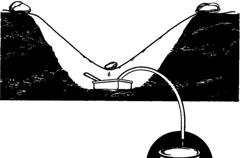 Выкопайте в земле яму диаметром примерно 90 см и глубиной около 45 см. Поставьте в центре резервуар для сбора воды и покройте яму пластиковой пленкой, придав ей конусообразную форму. Солнечное тепло повышает температуру воздуха и грунта внизу, и начинается испарение. Когда воздух становится насыщенным водяными парами, вода конденсируется на внутренней поверхности пленки и стекает по конусу в