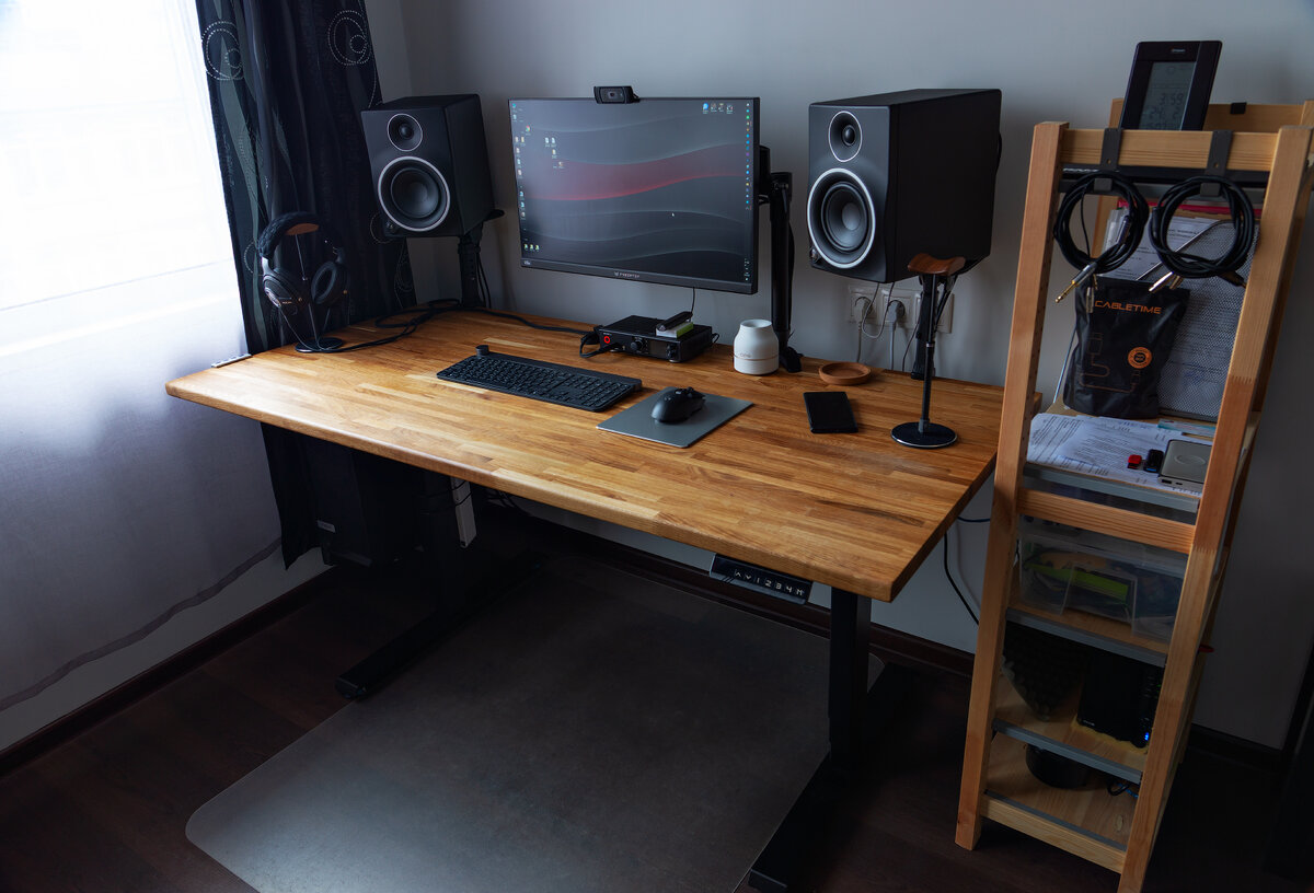 Поэтому я выбрал простой и красивый вариант – клееный дуб. Вес такой столешницы составляет около 30 кг при размерах 1600x760 мм при толщине 30 мм. Размер выбран исходя из параметров комнаты, где я работаю, а также простого соображения, что при еще большем размере я просто физически не смогу нормально дотянуться до некоторых областей стола. Практика показала, что, с учетом дополнительного выбранного оборудования (о чем ниже) такая площадь явилась для меня совершенно комфортной и практически максимальной, чтобы её еще можно было оптимально использовать.