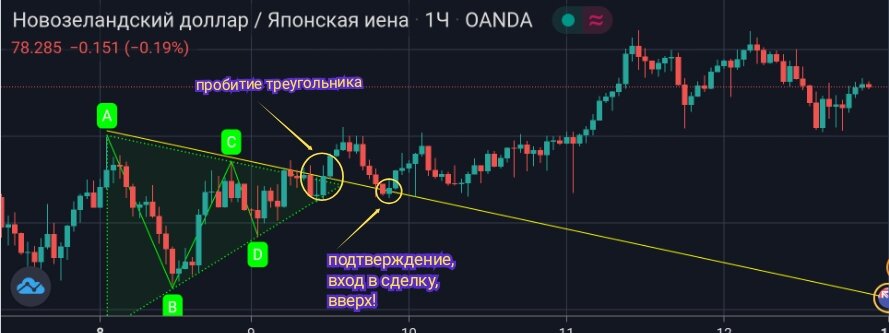 На фото видно по тех. анализу, был сформирован треугольник. После чего был пробит. Жёлтым лучом выявили наклонную линию поддержки от которой ждали отскок. Подойдя цена к желтому лучу, я зашел в сделку на рост, на 1 день или 24 часа.