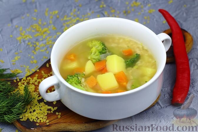 И ещё один рецепт овощного супчика для тех, кто ищет рецепты блюд без мяса и какого-либо жира - суп с брокколи и булгуром. Здесь также ничего не обжаривается, суп очень лёгкий, полезный. Выглядит ярким благодаря соцветиям капусты и кусочкам моркови. Брокколи можно использовать как свежую, так и замороженную.