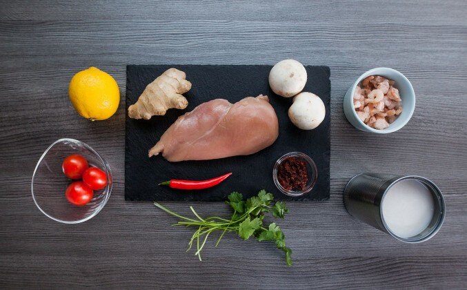 1. Нарезаем имбирь соломкой, срезаем с лимона 1 слайс цедры, измельчаем перец чили, нарезаем куриную грудку кубиками, и так же шампиньоны.