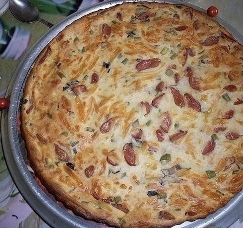 Яйца растереть с разрыхлителем (можно использовать соду) и солью, влить стакан кефира. Перемешать миксером, постепенно добавляя приготовленный стакан с мукой. Тесто должно получиться как для оладушек. Когда тесто вымешано, добавить натёртый твёрдый сыр, зелень (какую любите) и несколько нарезанных сосисок (можно колбасу или отварное мясо). Еще раз хорошо перемешать, выложить в форму, смазанную маслом и выпекать до готовности.