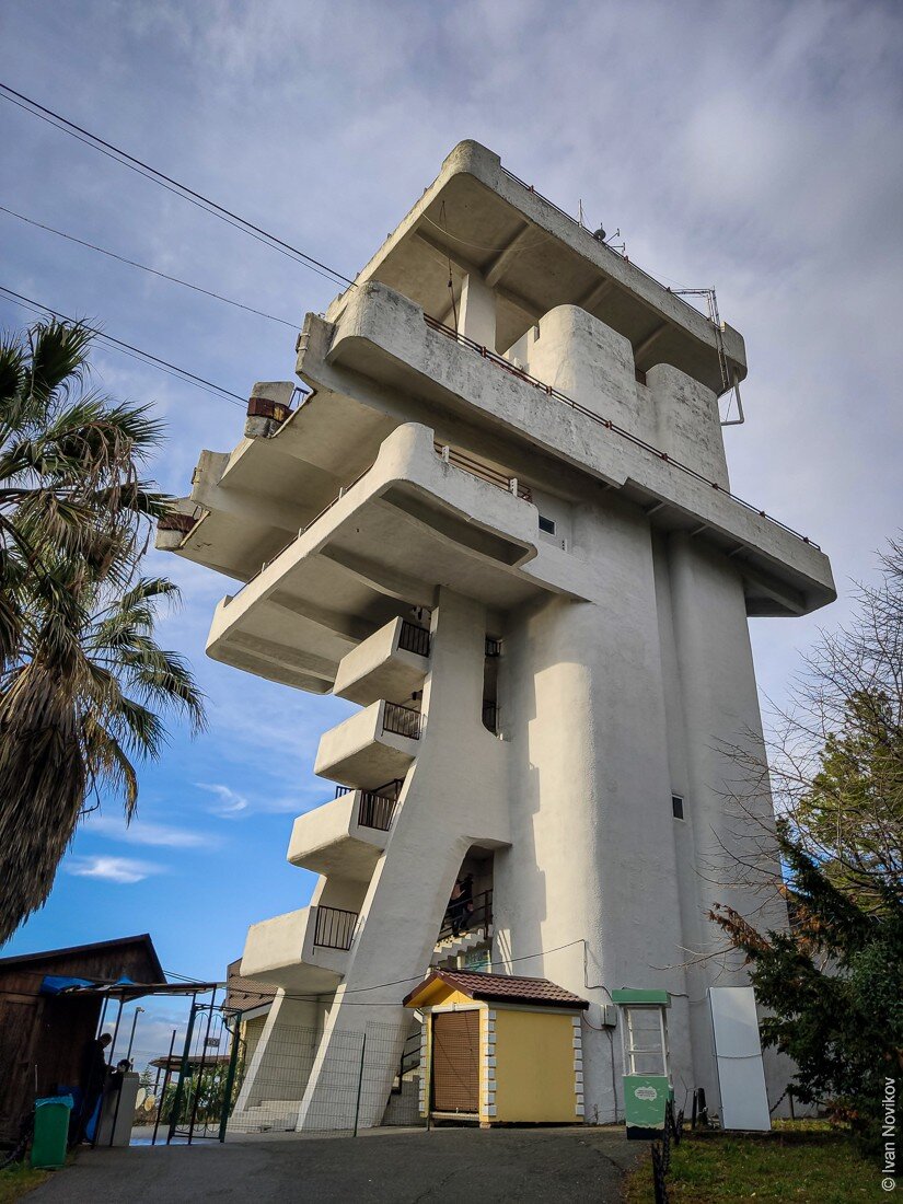 Я впервые приехал в Сочи и пишу свои наблюдения о городе. На этот раз мы прогуливались в сочинском дендрарии. По ровным аллеям среди дубов, пальм и кипарисов, поднимаясь все выше мой взор уперся в очень необычное по своей архитектуре сооружение. Оказалось, это верхняя станция канатной дороги и по совместительству обзорная площадка.